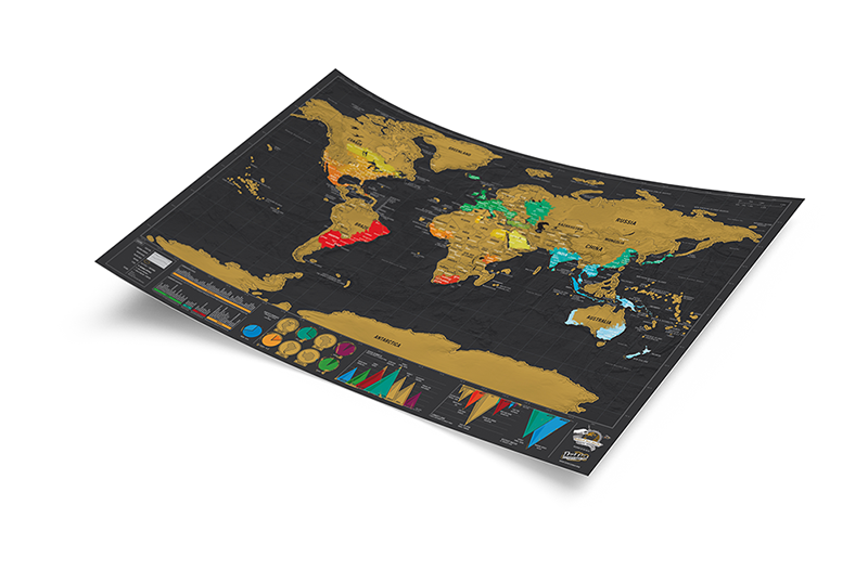 素黑底色的高質感彩色地圖,上面覆蓋一層金色的箔片,比原本刮刮樂世界地圖增加更多的細節,包括更多的小島、城市、海洋,只要將去過的地方刮一刮,底下鮮明顏色的地圖就會出現,這是一張隨著時間慢慢呈現你的生活和旅行經歷的地圖,絕對性的獨一無二。更小的尺寸便於攜帶,或是裝飾在辦公室的隔間牆上,讓你隨處都能享受刮刮樂的樂趣!